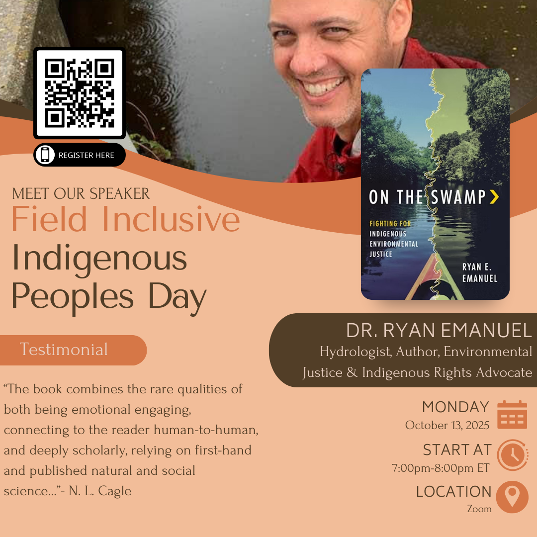 Raleigh, NC (Virtual) Monday, October 13, 2025 7:00 PM 8:00 PM Google Calendar ICS Ryan presents Indigenous Peoples’ Day webinar with Field Inclusive, a nonprofit that supports field researchers from marginalized groups. Event includes book giveaway. Support the work of Field Inclusive here.